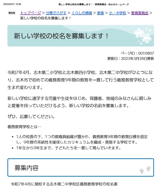2023/03/31にこの事態に気づき、すぐに市の教育課へ反対していることを伝え、「学校名募集停止・取り下げ」をお願いした。市は募集停止するつもりはないとのこと。